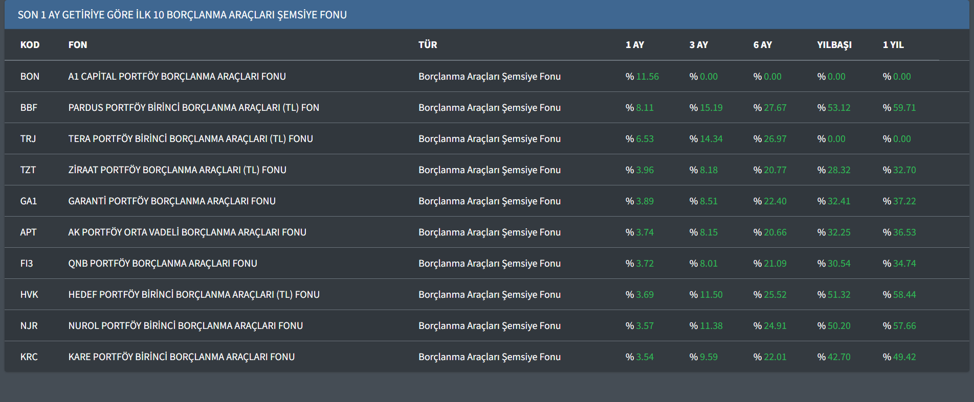 SON 1 AY GETİRİYE GÖRE İLK 10 BORÇLANMA ARAÇLARI ŞEMSİYE FONU