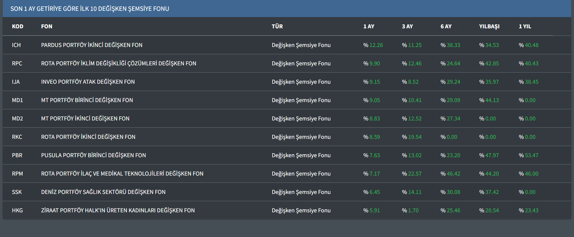 SON 1 AY GETİRİYE GÖRE İLK 10 DEĞİŞKEN ŞEMSİYE FONU