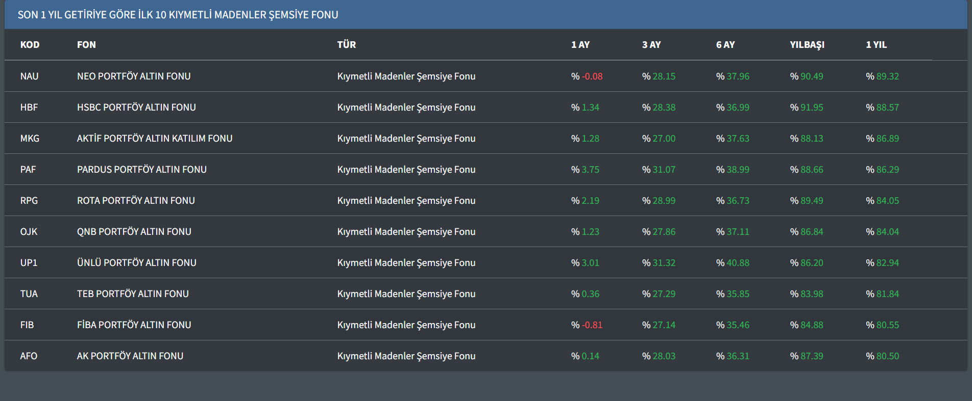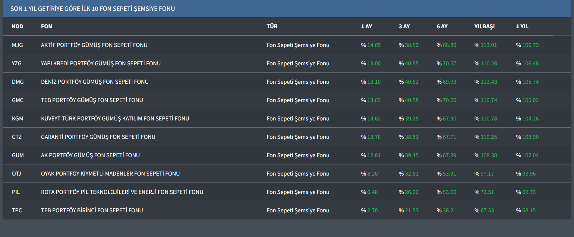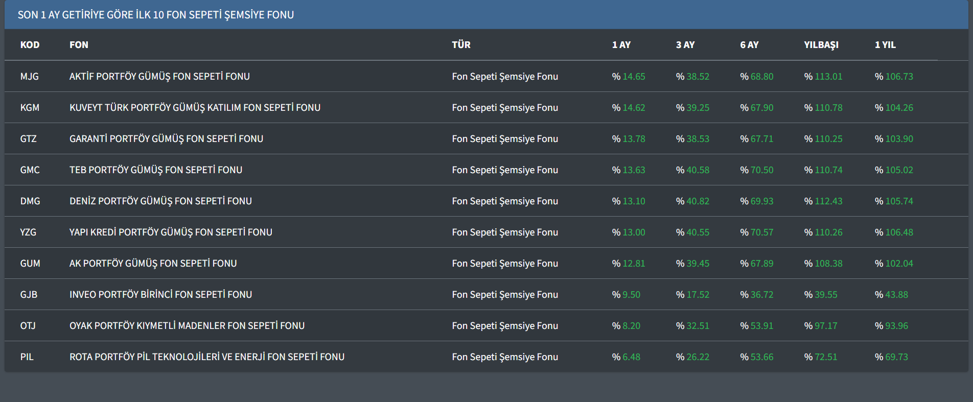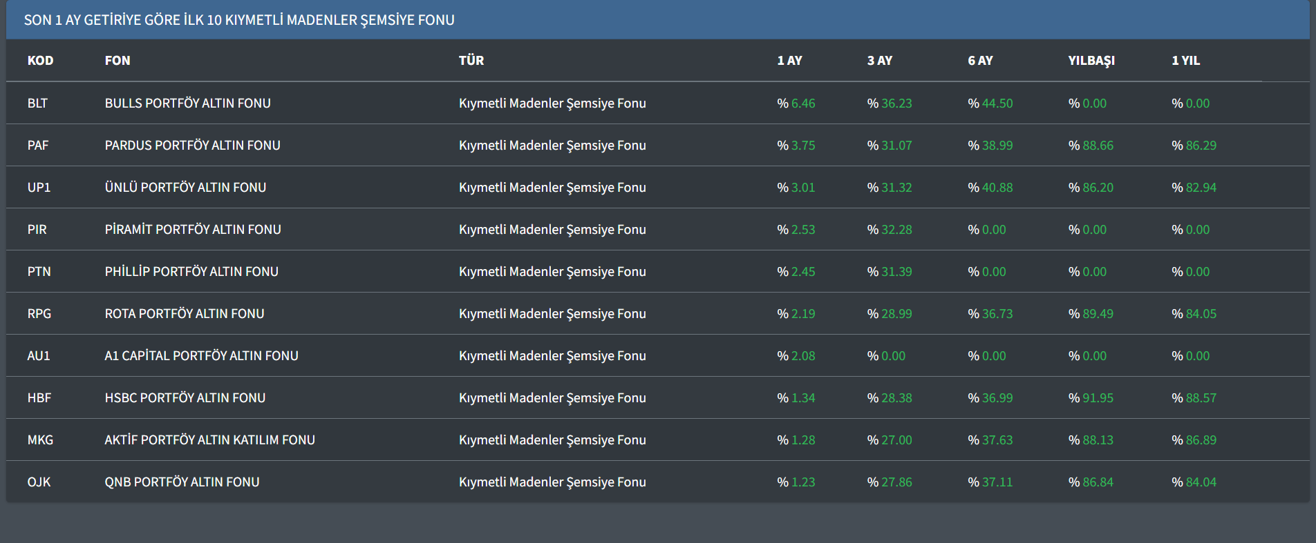 SON 1 AY GETİRİYE GÖRE İLK 10 KIYMETLİ MADENLER ŞEMSİYE FONU