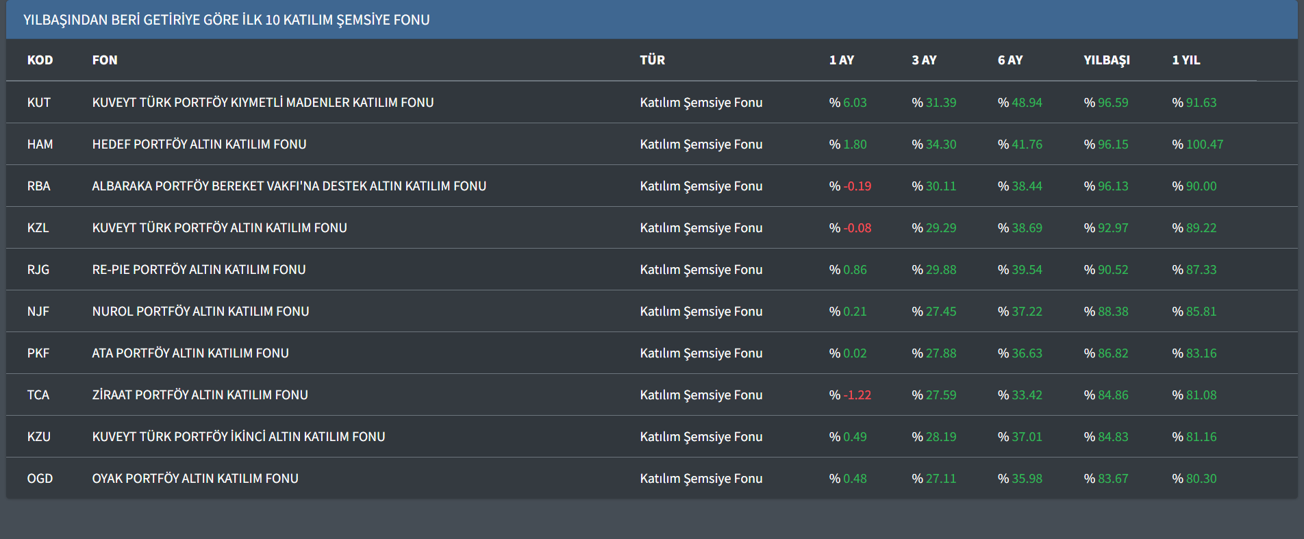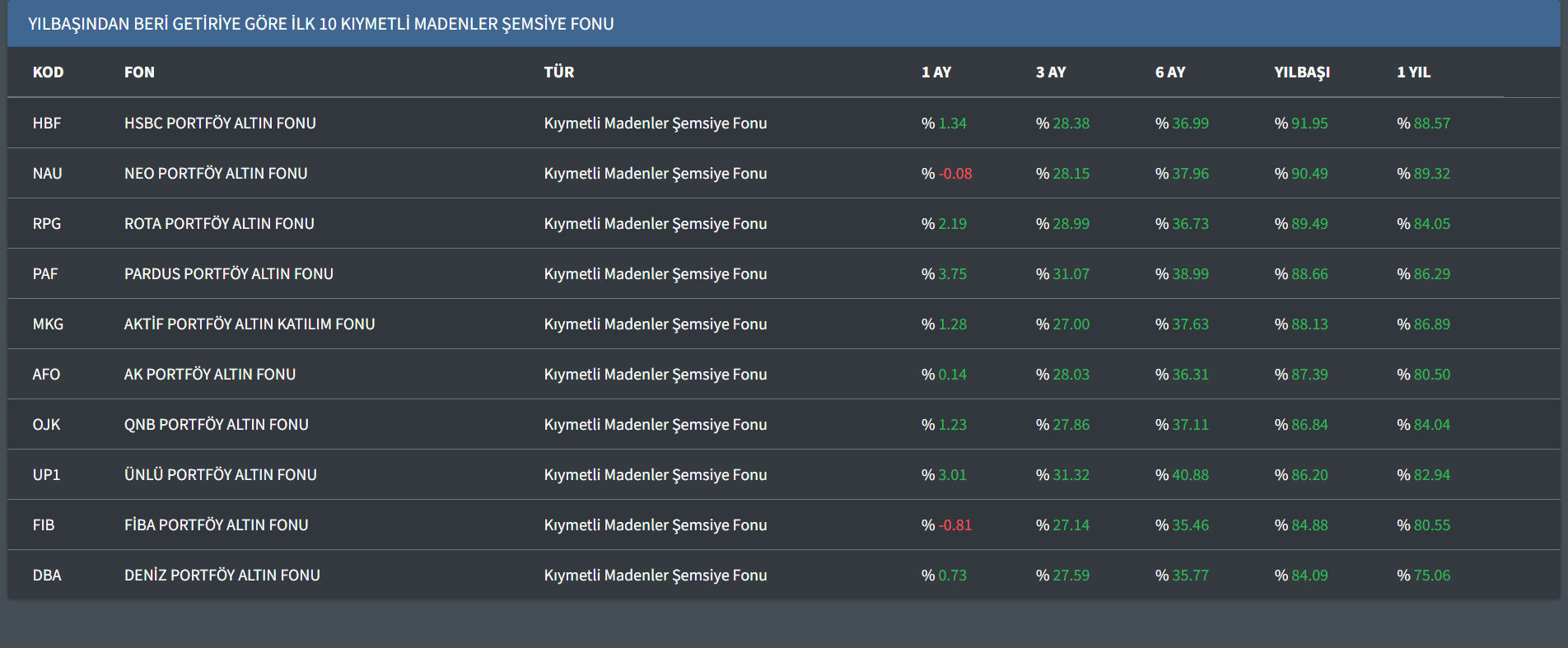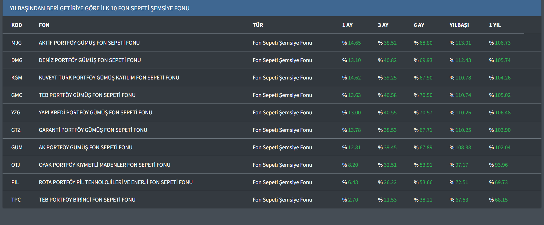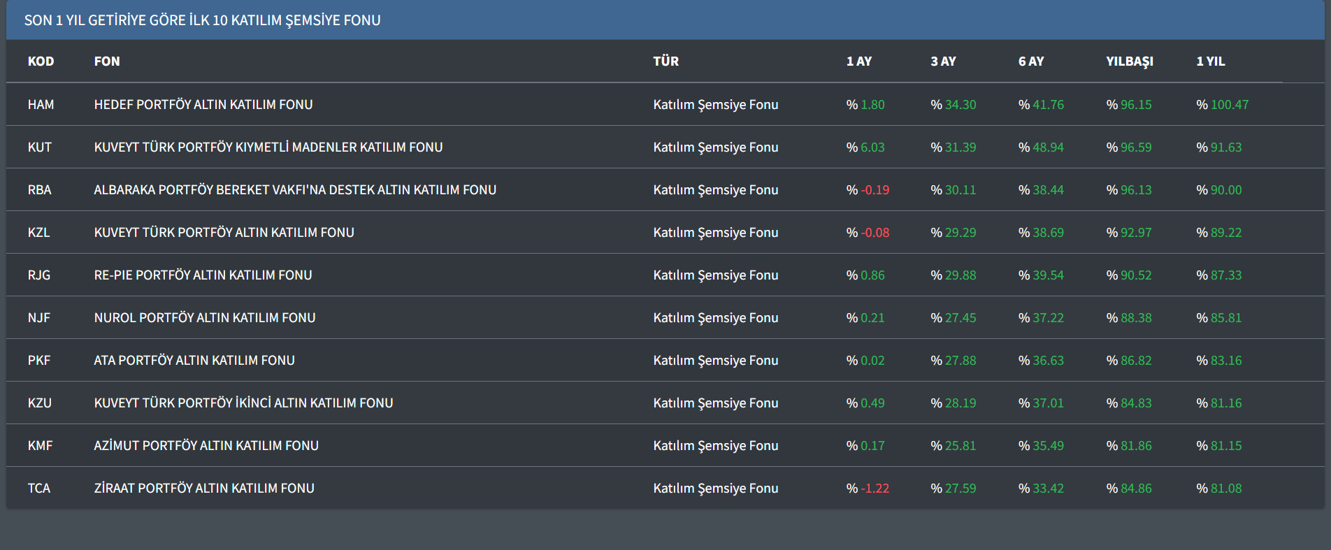 SON 1 AY GETİRİYE GÖRE İLK 10 KIYMETLİ MADENLER ŞEMSİYE FONU