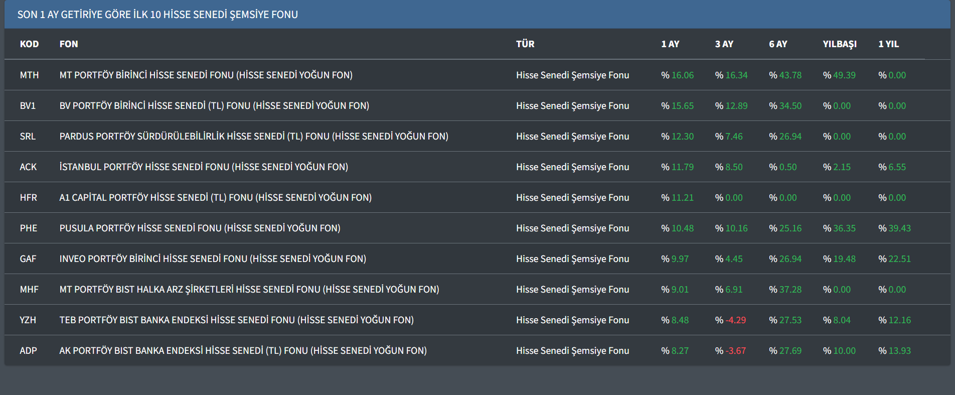 SON 1 AY GETİRİYE GÖRE İLK 10 HİSSE SENEDİ ŞEMSİYE FONU