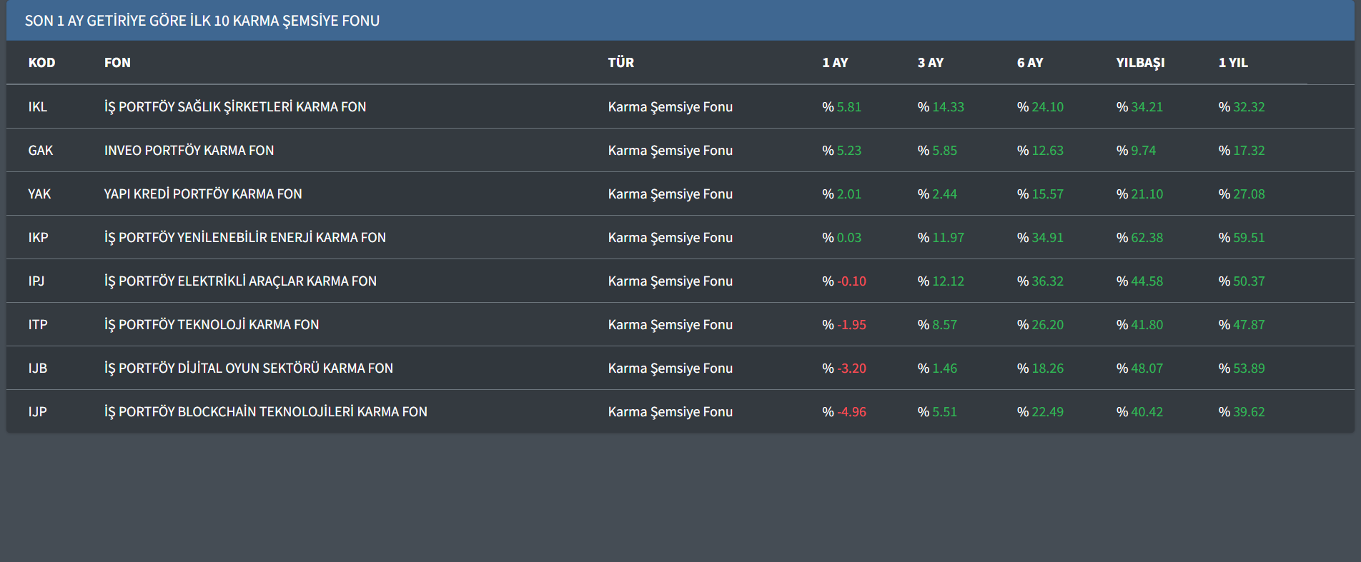 SON 1 AY GETİRİYE GÖRE İLK 10 KARMA ŞEMSİYE FONU