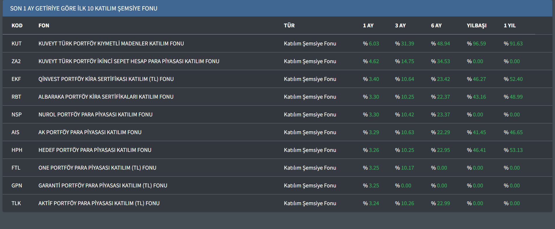 SON 1 AY GETİRİYE GÖRE İLK 10 KATILIM ŞEMSİYE FONU