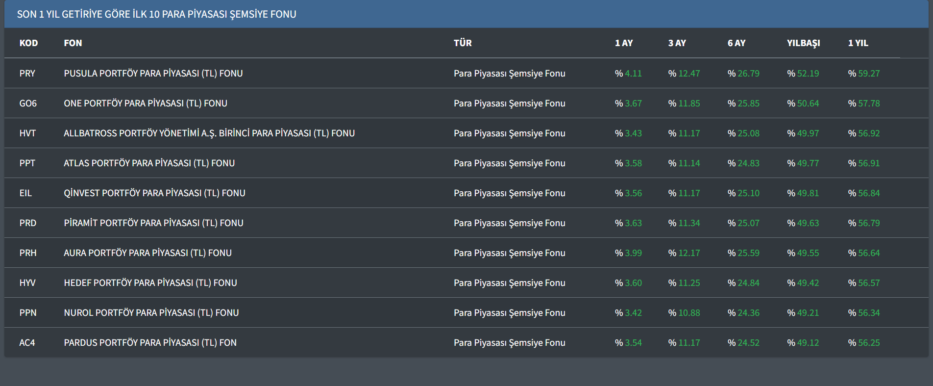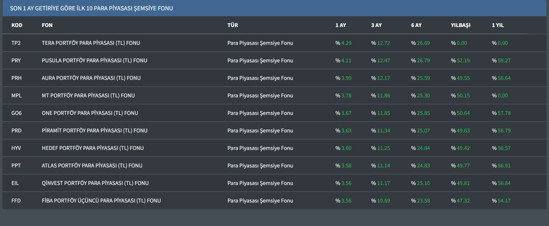 SON 1 AY GETİRİYE GÖRE İLK 10 PARA PİYASASI ŞEMSİYE FONU