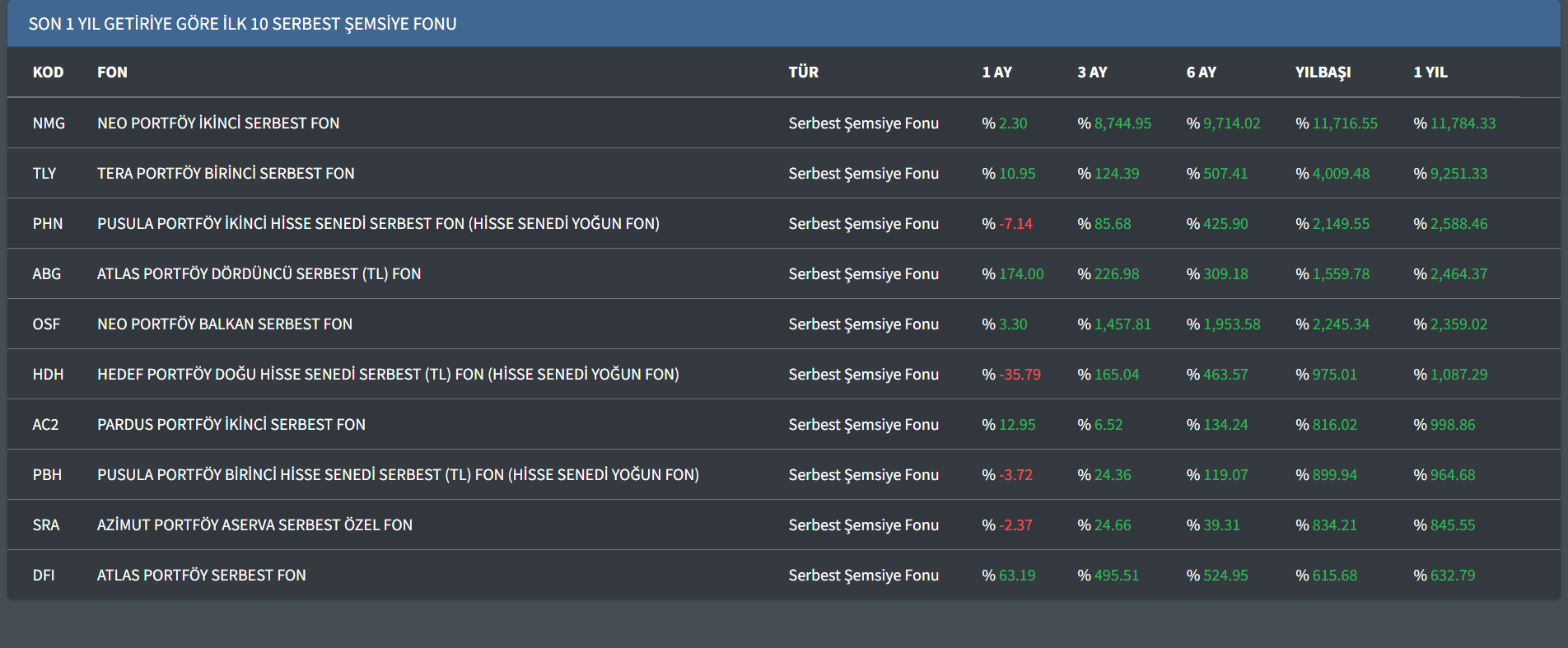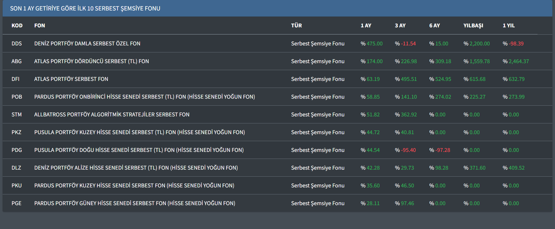 SON 1 AY GETİRİYE GÖRE İLK 10 SERBEST ŞEMSİYE FONU