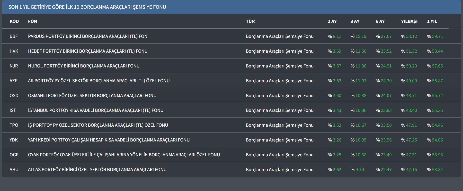 SON 1 YIL GETİRİYE GÖRE İLK 10 BORÇLANMA ARAÇLARI ŞEMSİYE FONU