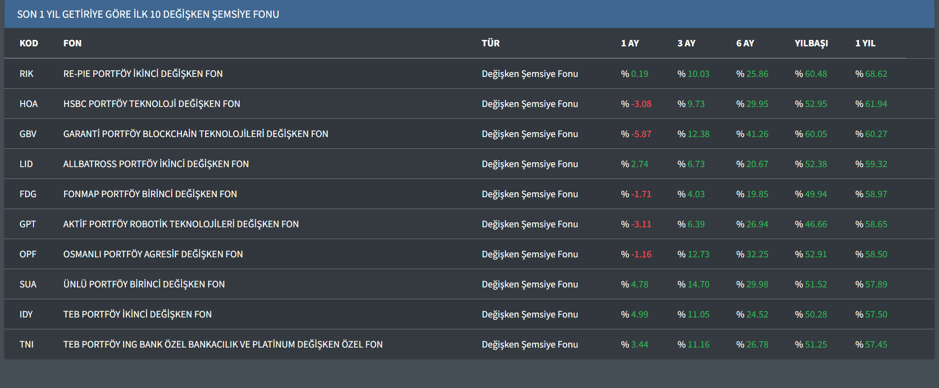 SON 3 AY GETİRİYE GÖRE İLK 10 DEĞİŞKEN ŞEMSİYE FONU