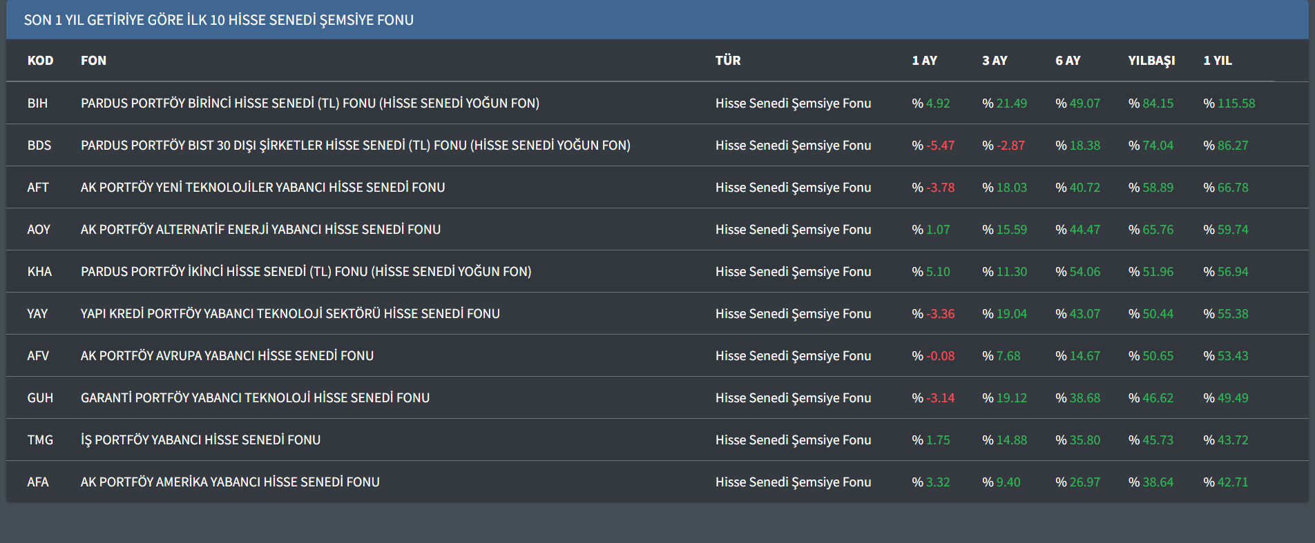 SON 1 YIL GETİRİYE GÖRE İLK 10 HİSSE SENEDİ ŞEMSİYE FONU