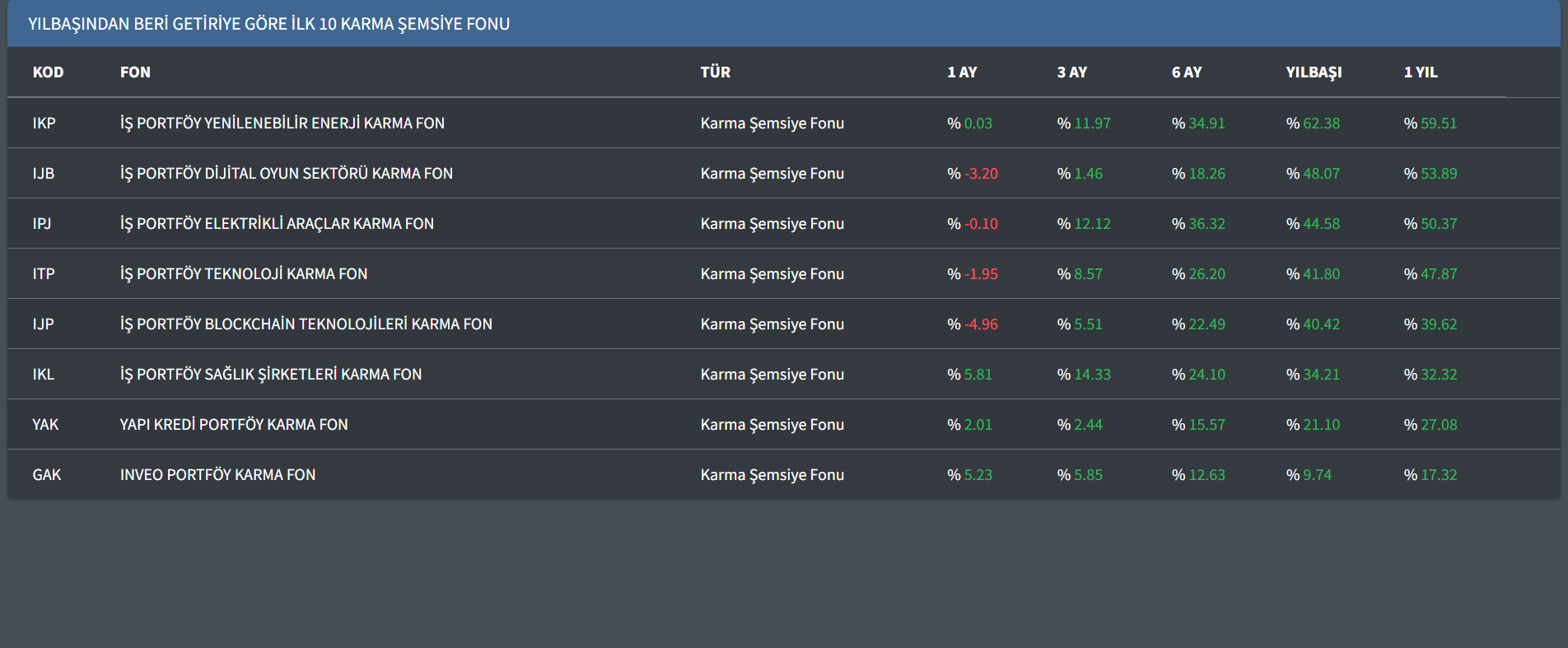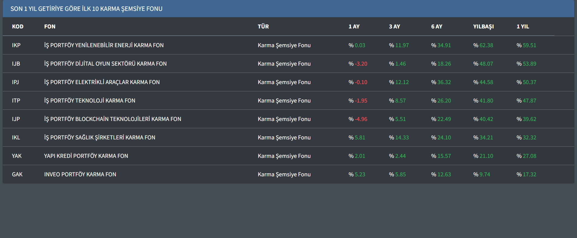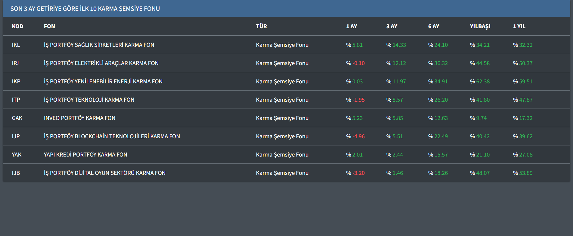 SON 3 AY GETİRİYE GÖRE İLK 10 KARMA ŞEMSİYE FONU