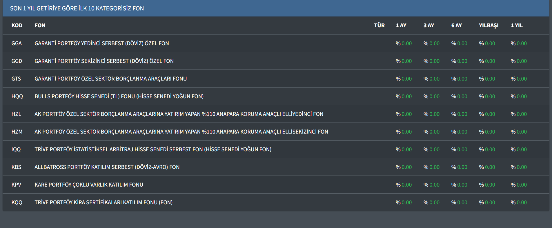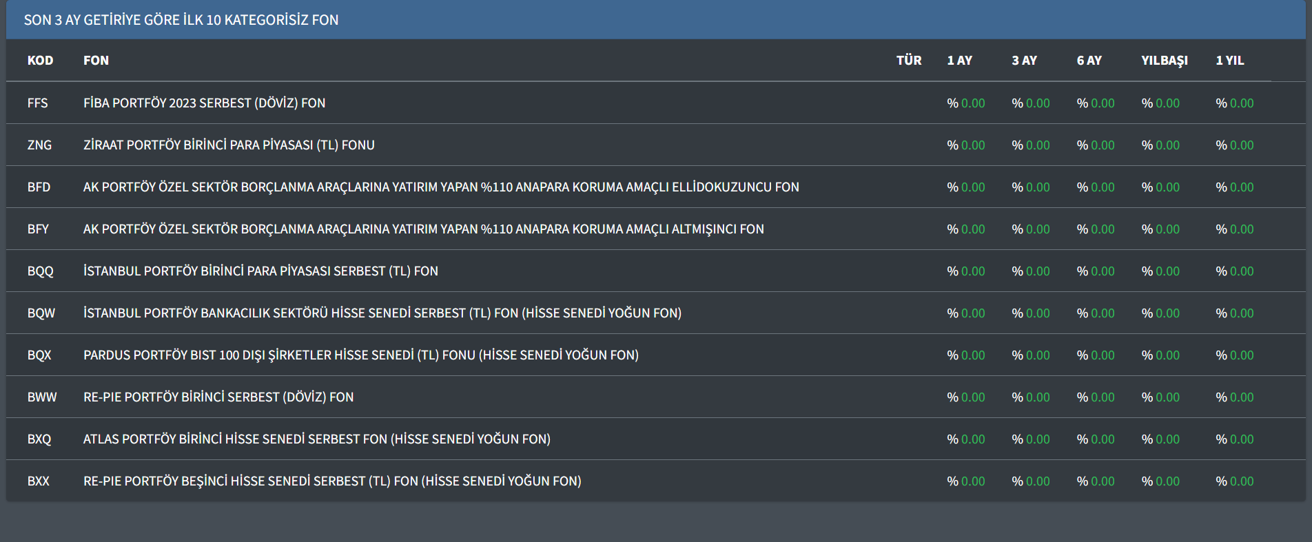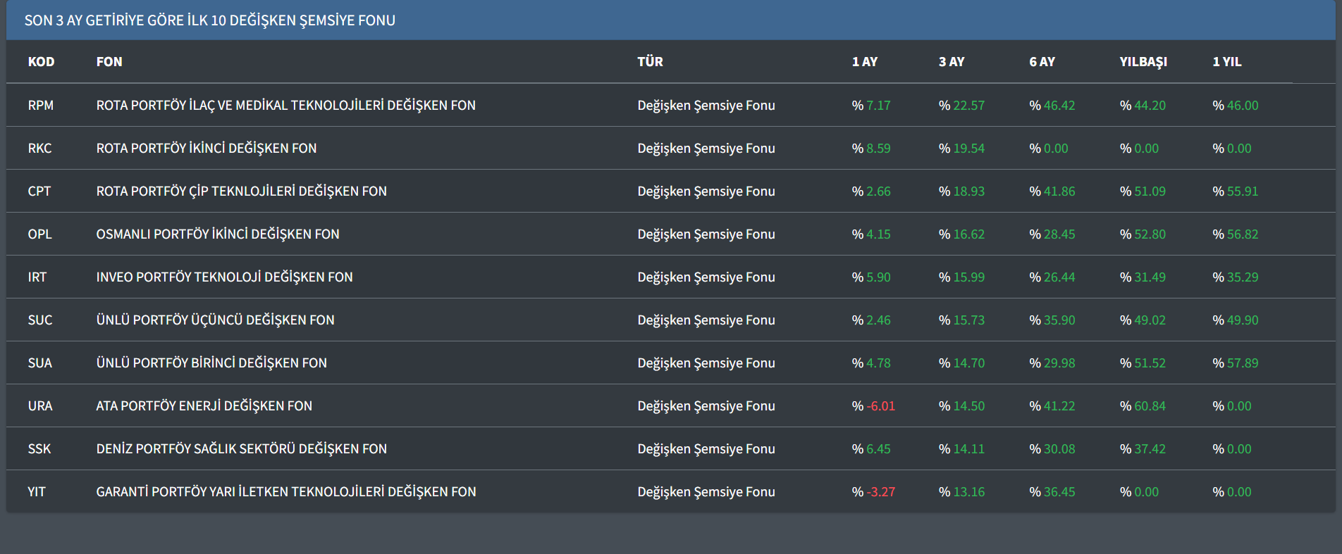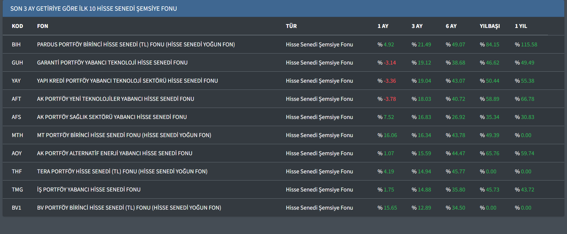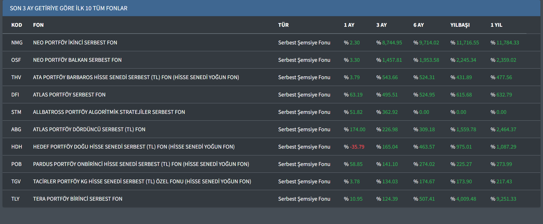 SON 3 AY GETİRİYE GÖRE İLK 10 TÜM FONLAR