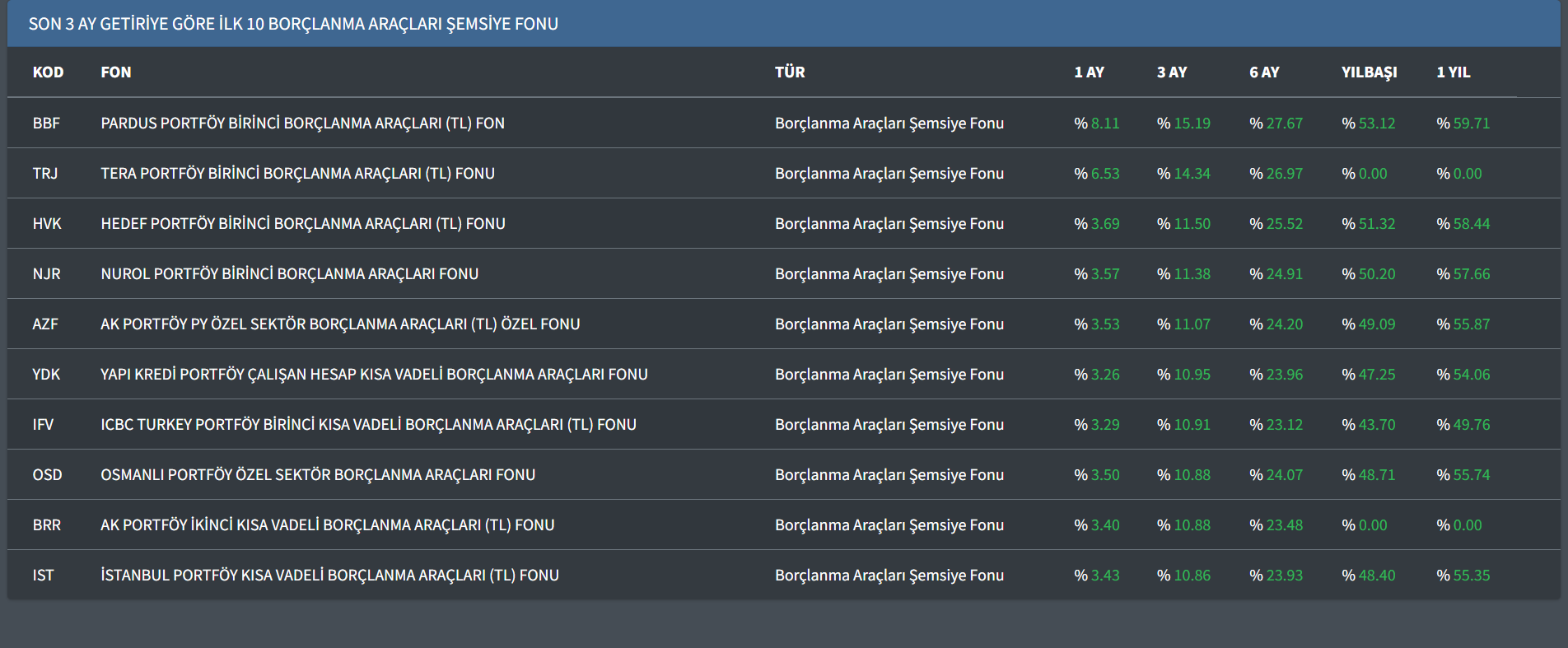 SON 3 AY GETİRİYE GÖRE İLK 10 BORÇLANMA ARAÇLARI ŞEMSİYE FONU
