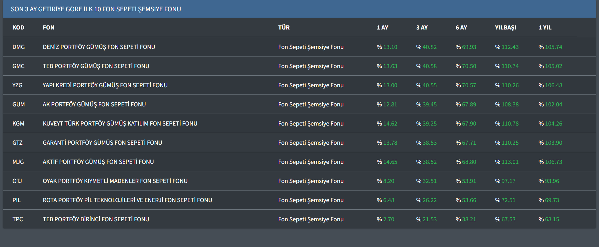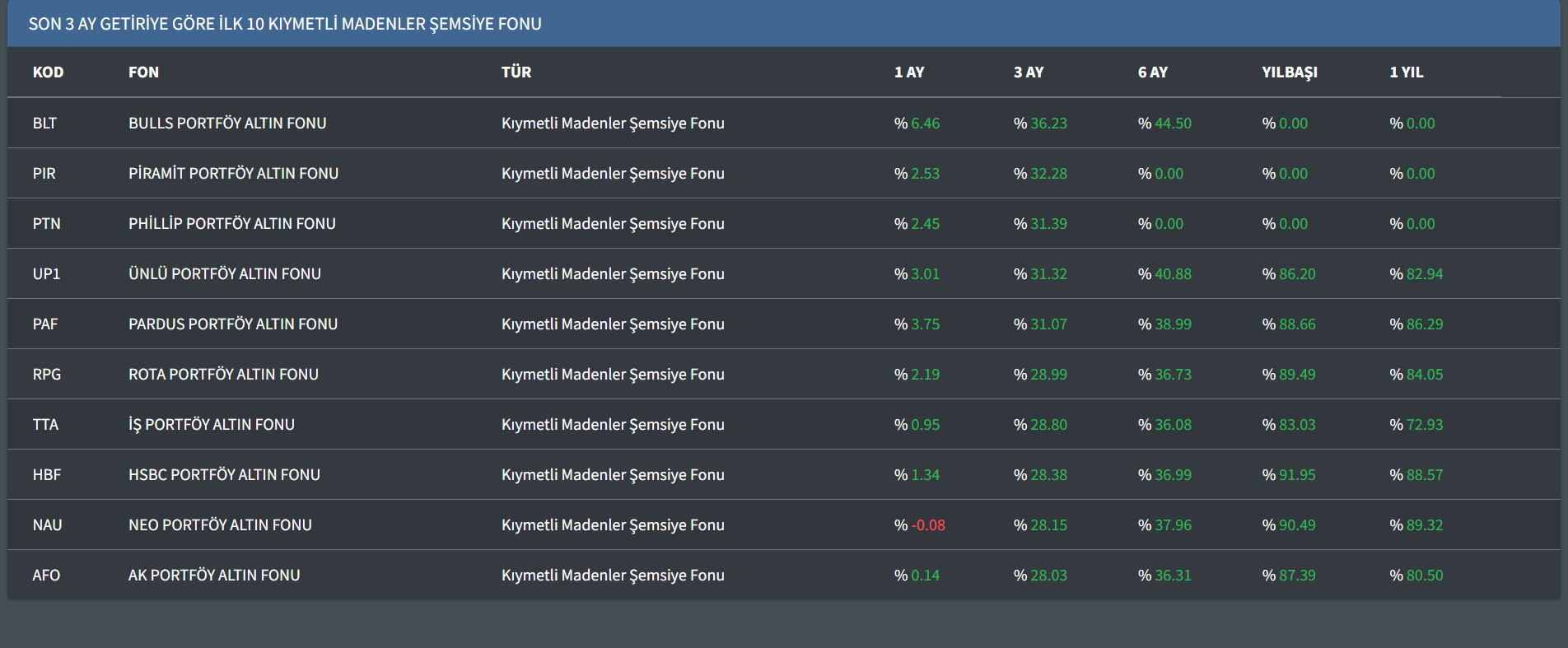SON 3 AY GETİRİYE GÖRE İLK 10 KIYMETLİ MADENLER ŞEMSİYE FONU