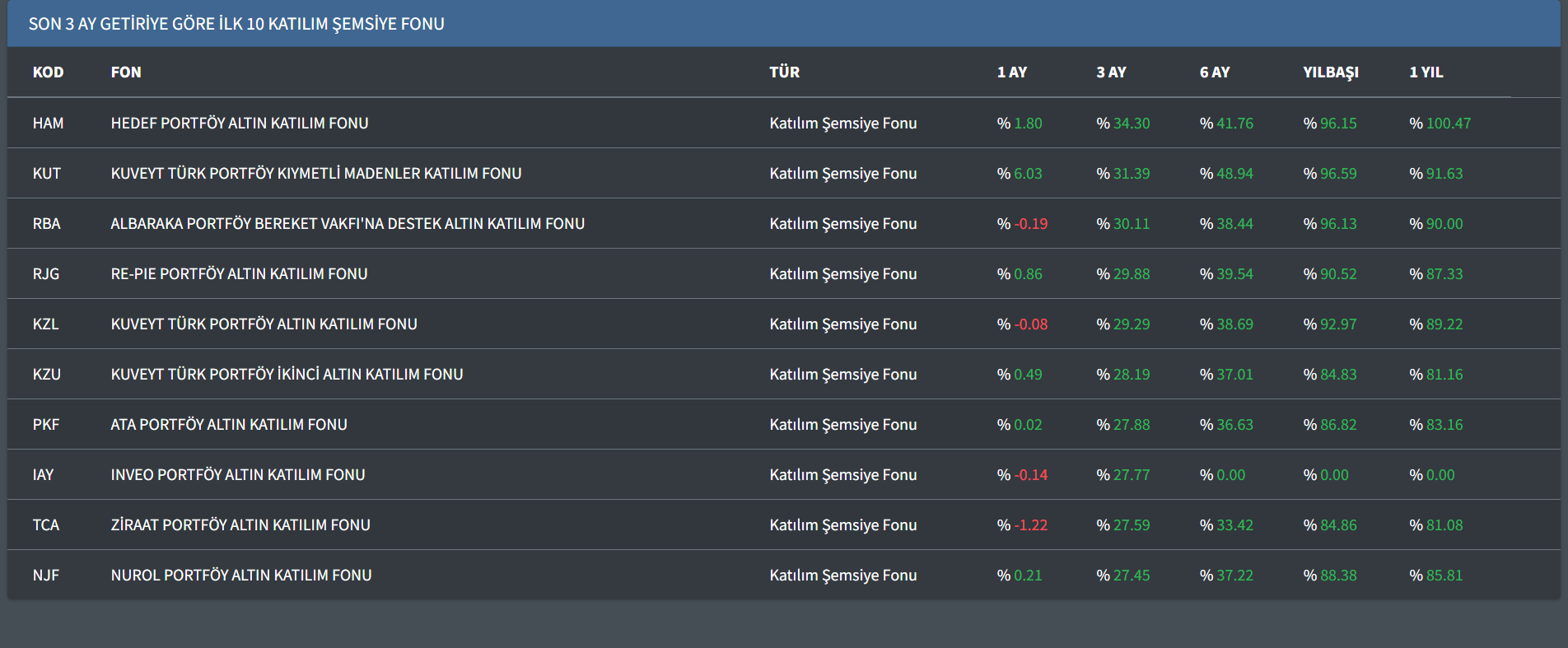 SON 3 AY GETİRİYE GÖRE İLK 10 KATILIM ŞEMSİYE FONU