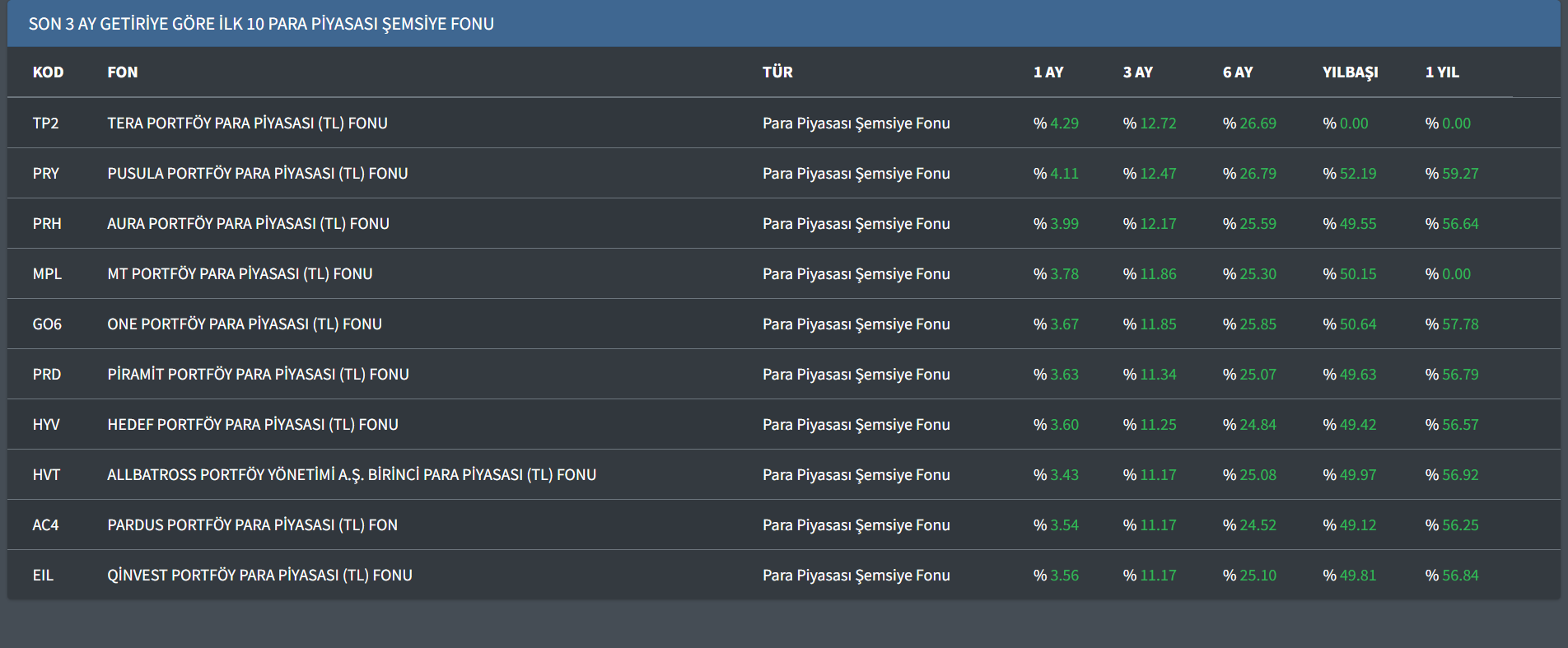 SON 3 AY GETİRİYE GÖRE İLK 10 PARA PİYASASI ŞEMSİYE FONU