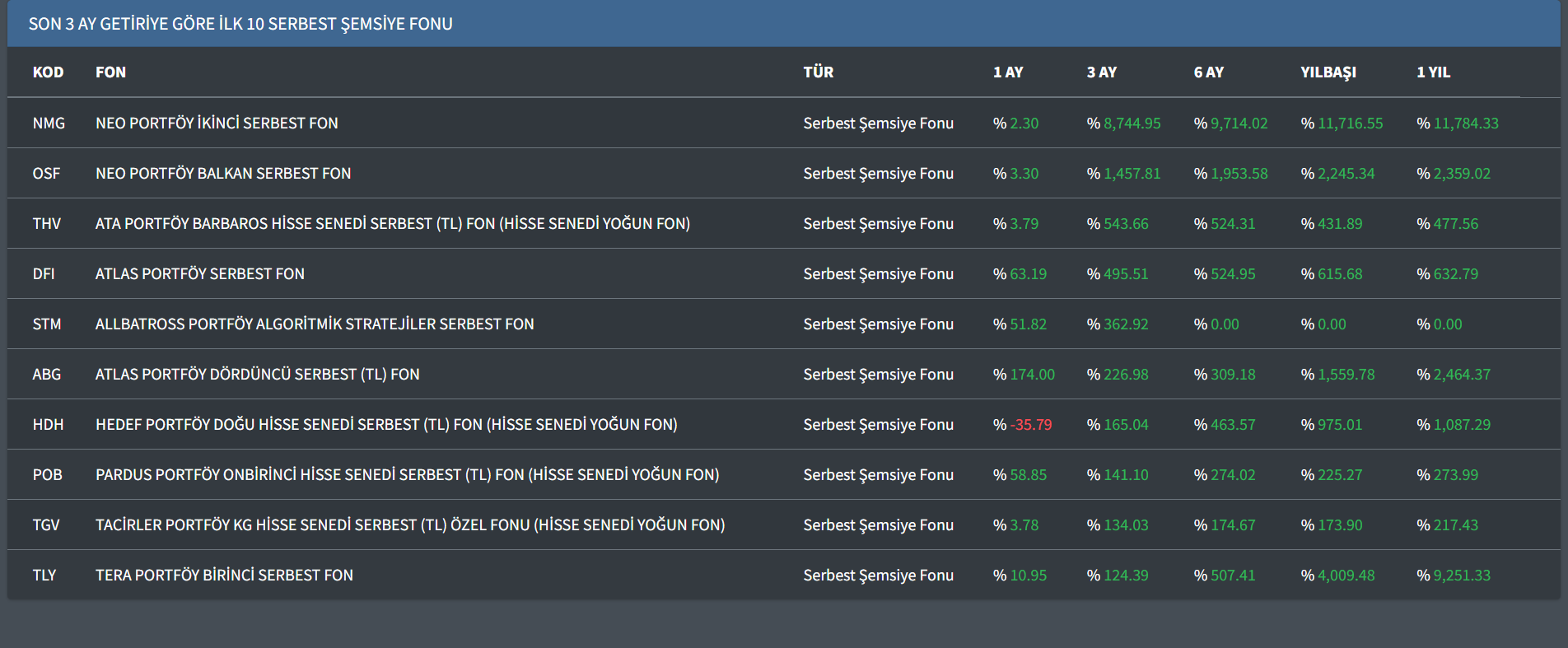 SON 3 AY GETİRİYE GÖRE İLK 10 SERBEST ŞEMSİYE FONU
