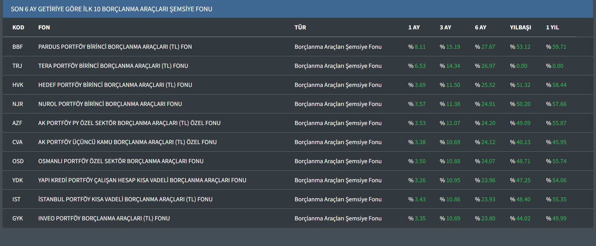 SON 6 AY GETİRİYE GÖRE İLK 10 BORÇLANMA ARAÇLARI ŞEMSİYE FONU