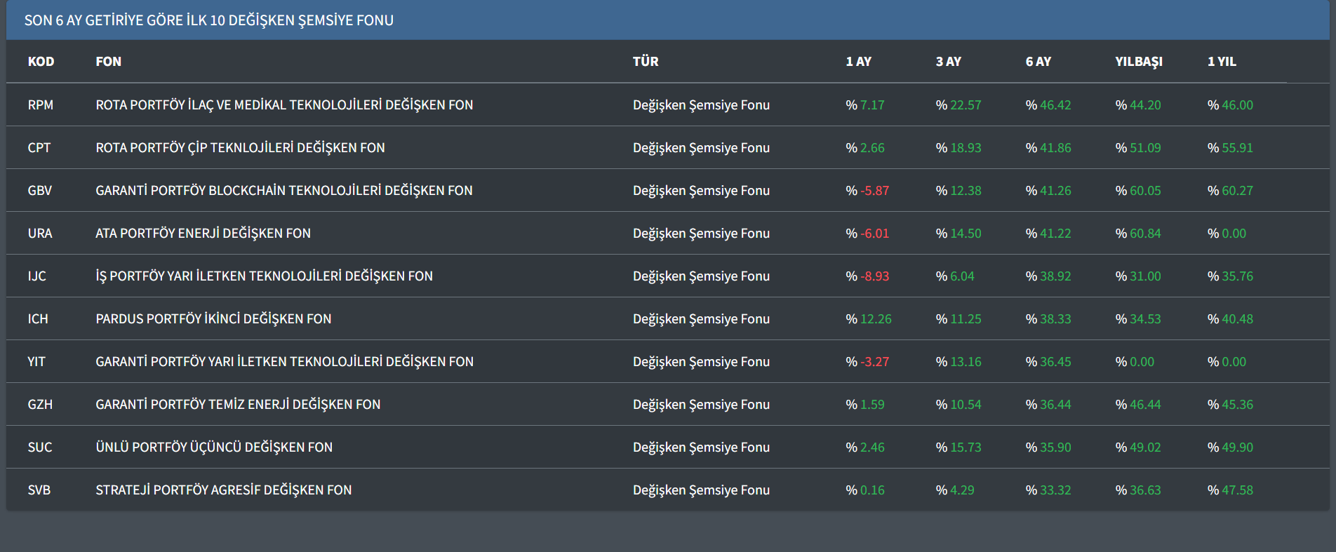 SON 6 AY GETİRİYE GÖRE İLK 10 DEĞİŞKEN ŞEMSİYE FONU