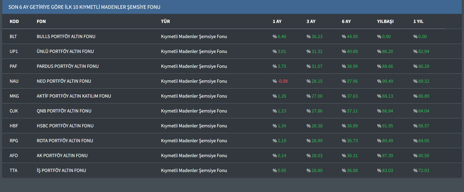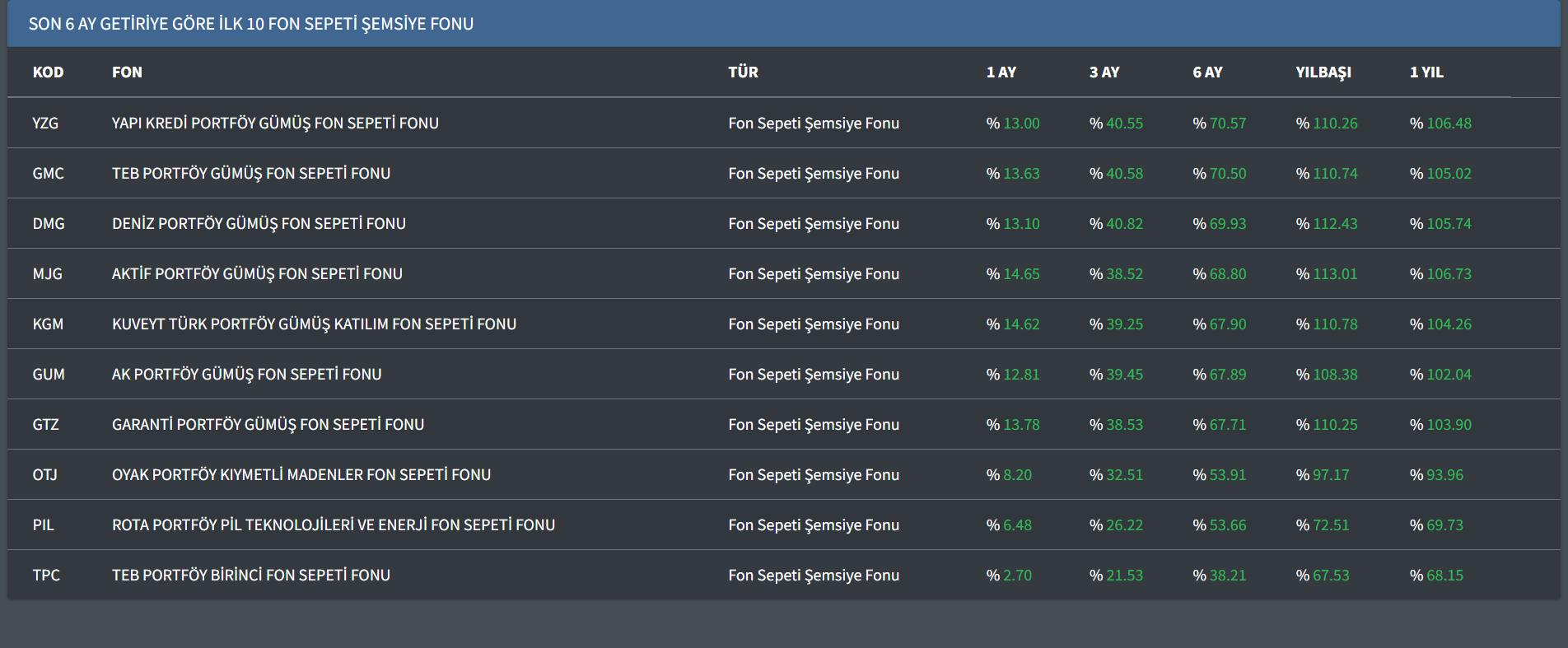 SON 6 AY GETİRİYE GÖRE İLK 10 KIYMETLİ MADENLER ŞEMSİYE FONU