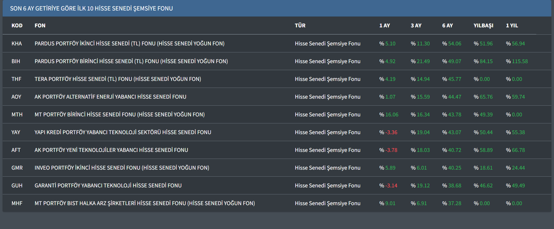 SON 6 AY GETİRİYE GÖRE İLK 10 HİSSE SENEDİ ŞEMSİYE FONU