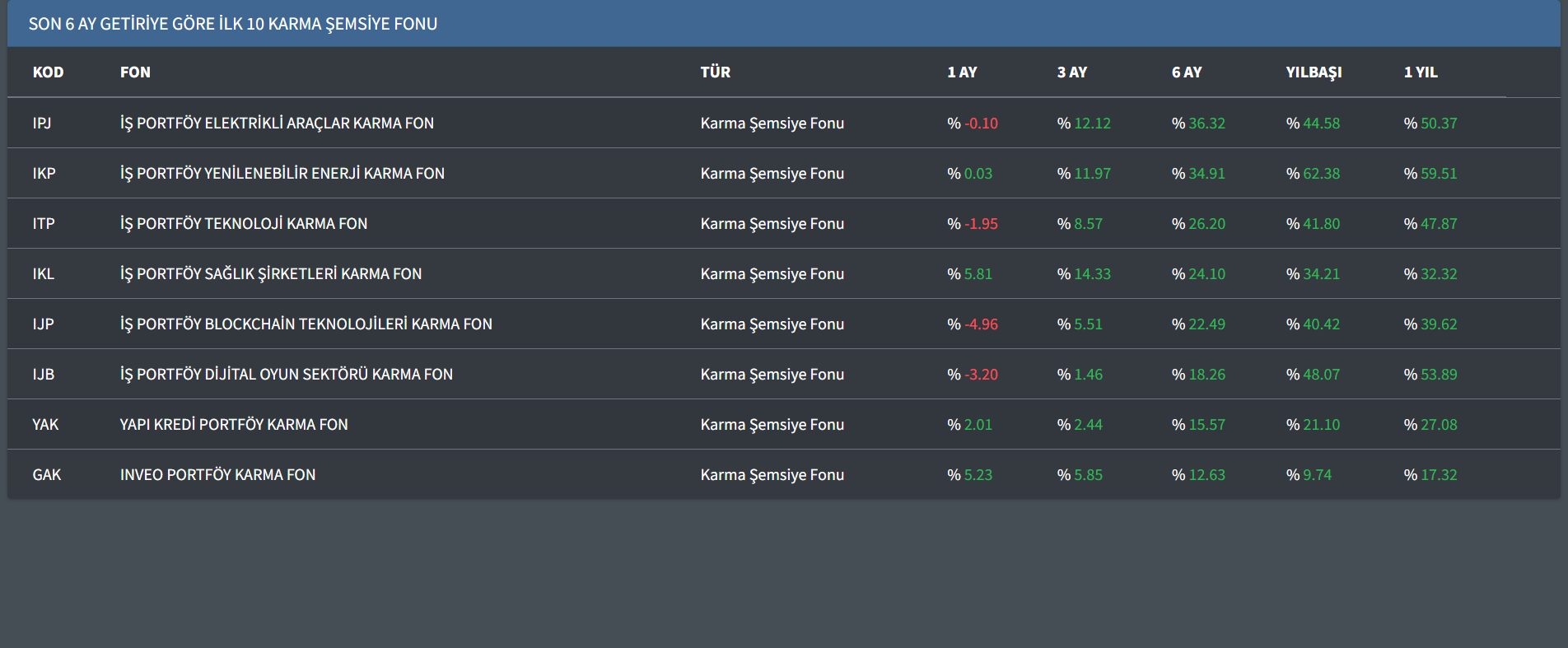 SON 6 AY GETİRİYE GÖRE İLK 10 KARMA ŞEMSİYE FONU
