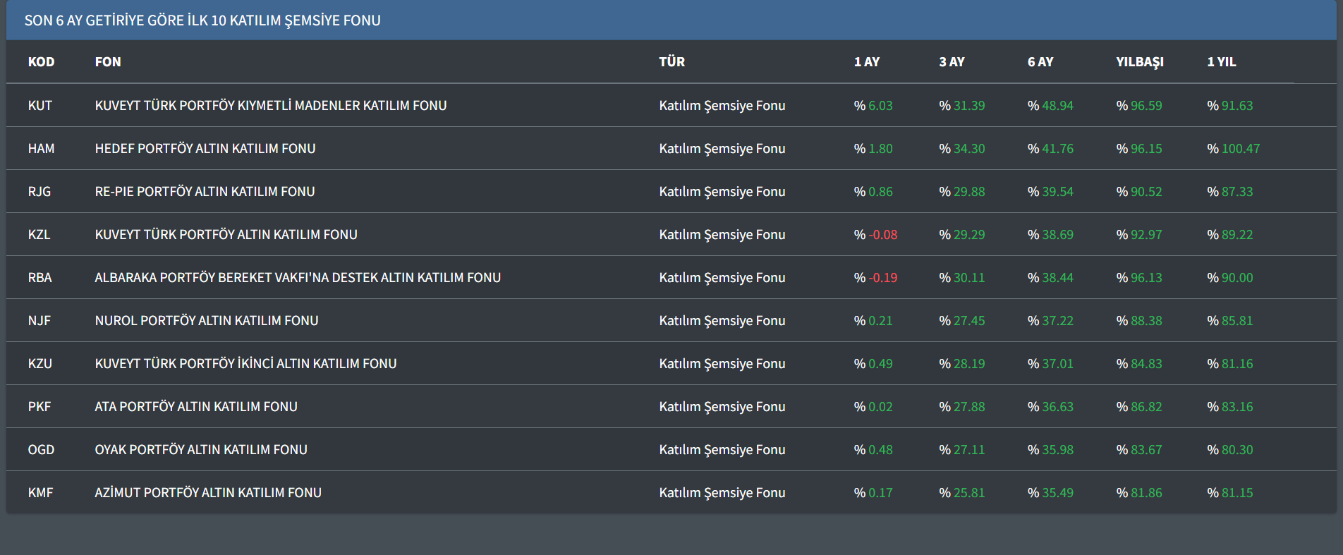 SON 6 AY GETİRİYE GÖRE İLK 10 KATILIM ŞEMSİYE FONU