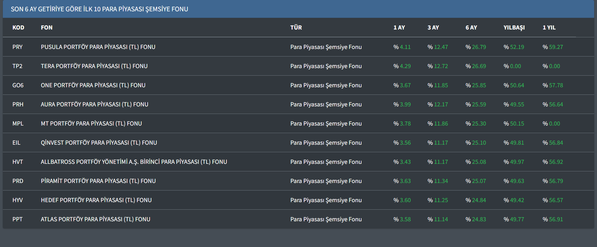 SON 6 AY GETİRİYE GÖRE İLK 10 PARA PİYASASI ŞEMSİYE FONU