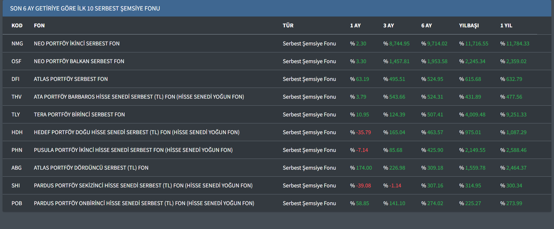 SON 6 AY GETİRİYE GÖRE İLK 10 SERBEST ŞEMSİYE FONU