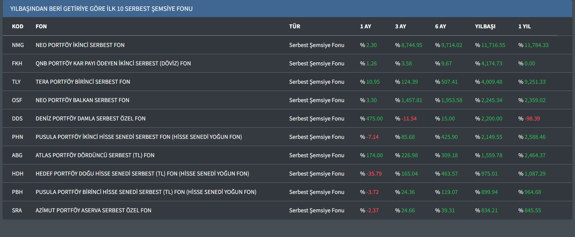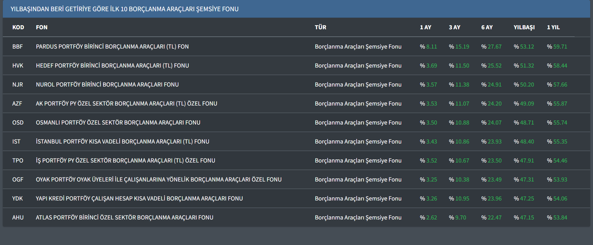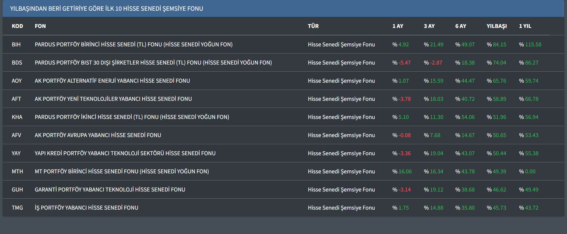 YILBAŞINDAN BERİ GETİRİYE GÖRE İLK 10 TÜM FONLAR