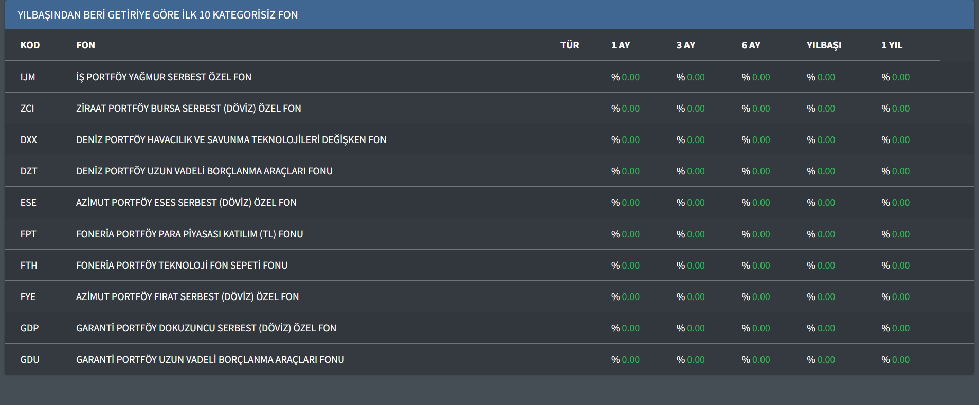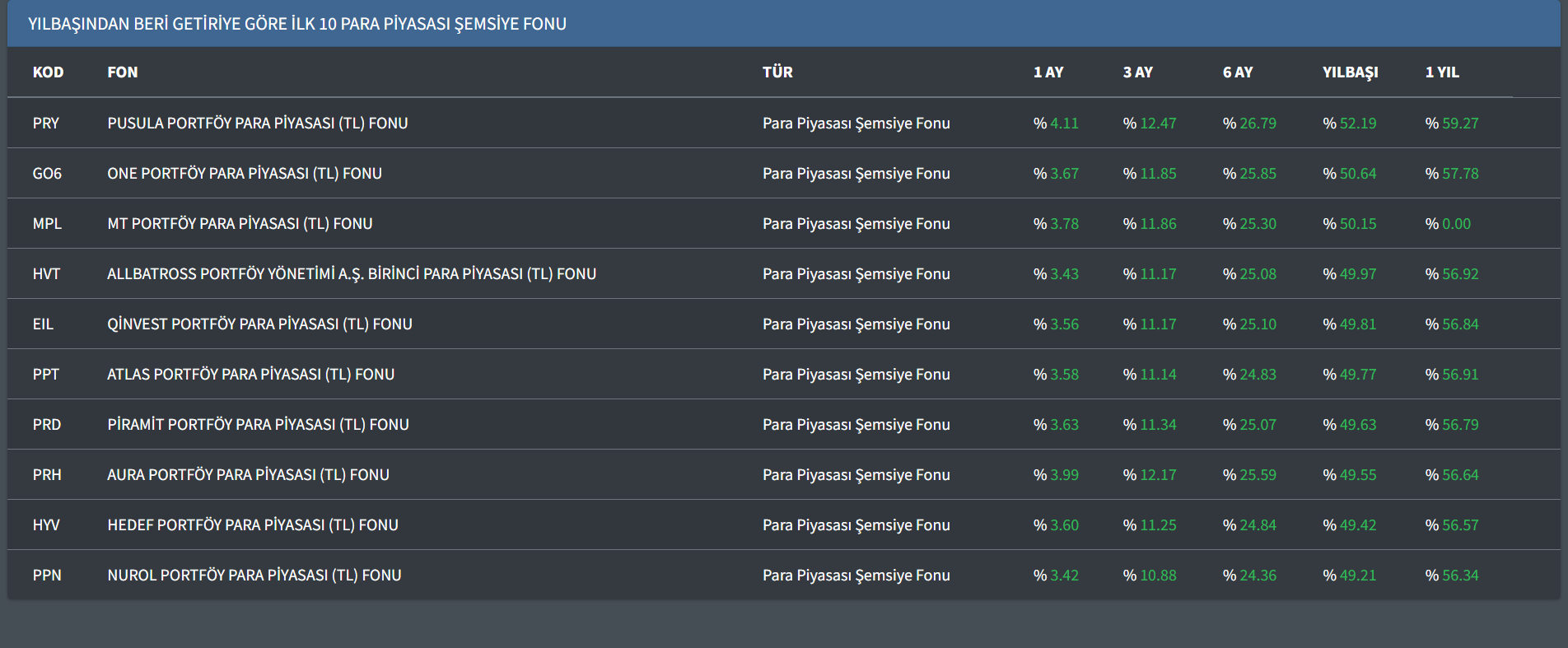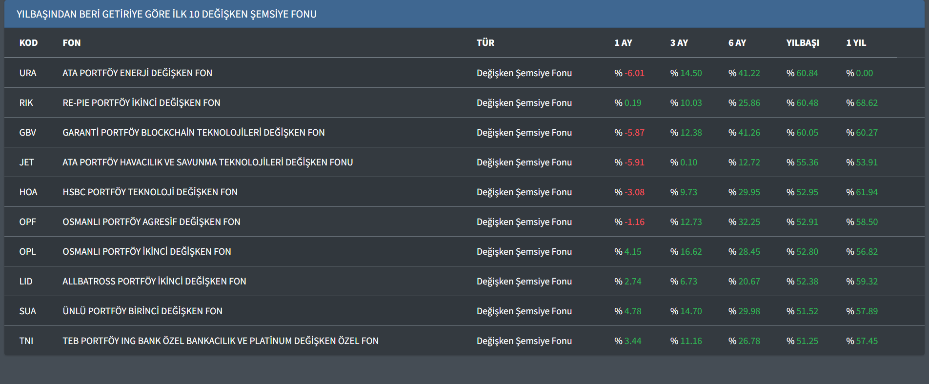 YILBAŞINDAN BERİ GETİRİYE GÖRE İLK 10 TÜM FONLAR